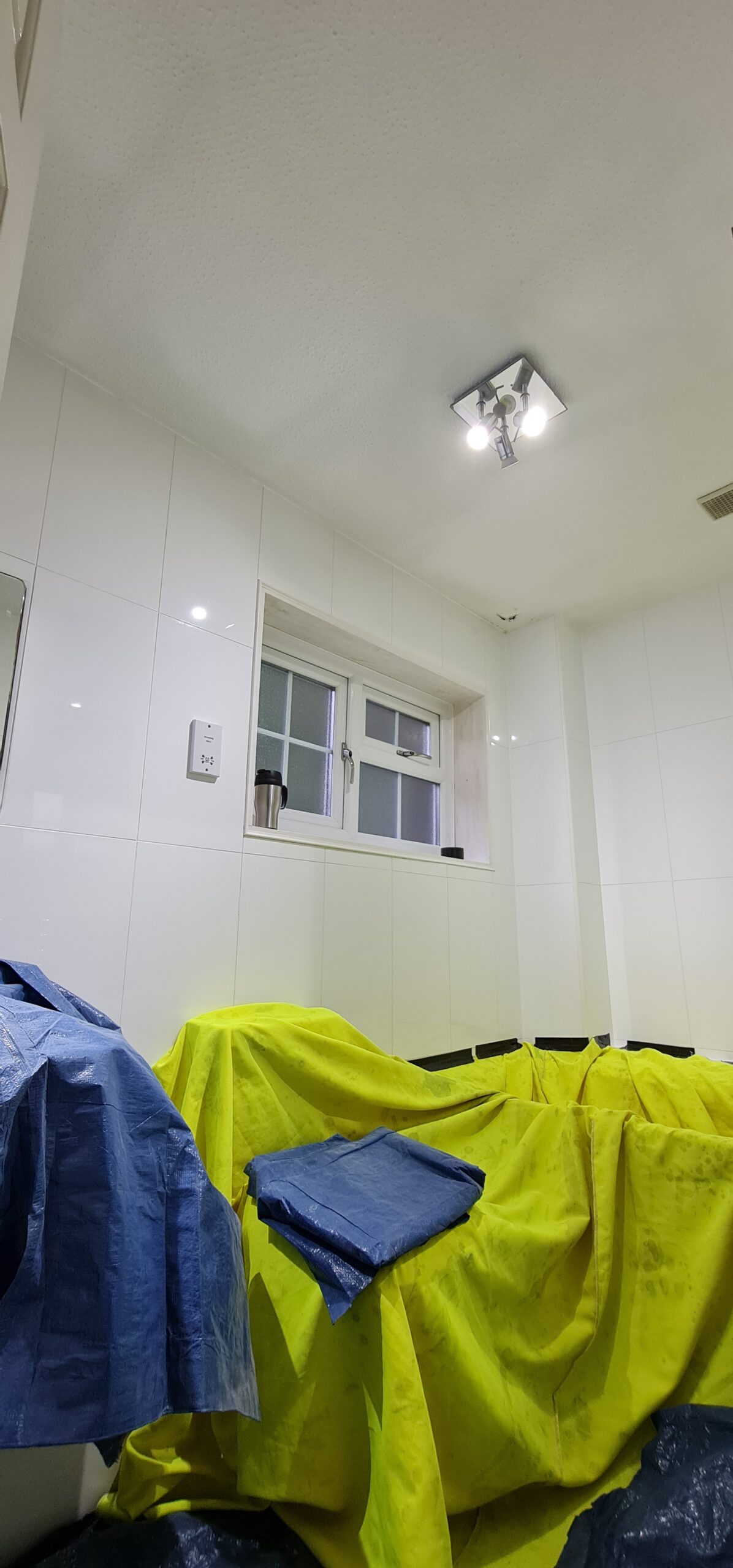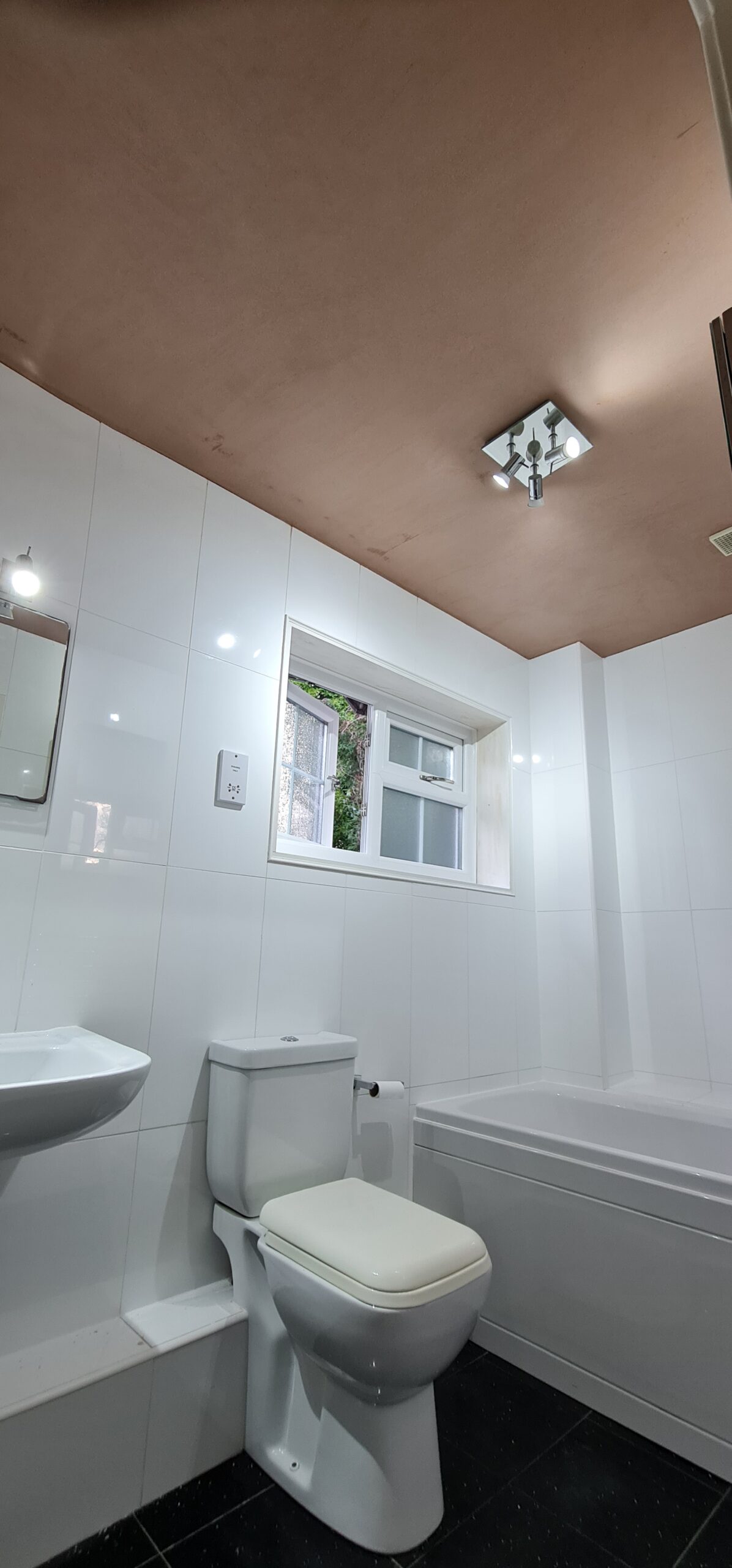 A slight leak onto this ceiling caused some minor damage. The customer wanted the damage repairing and the ceiling to be flat. So, thats what i did. Scraped ceiling, repaired hole, taped cracks, glued ceiling, skimmed flat. Minimum fuss and minimum mess, plastering.