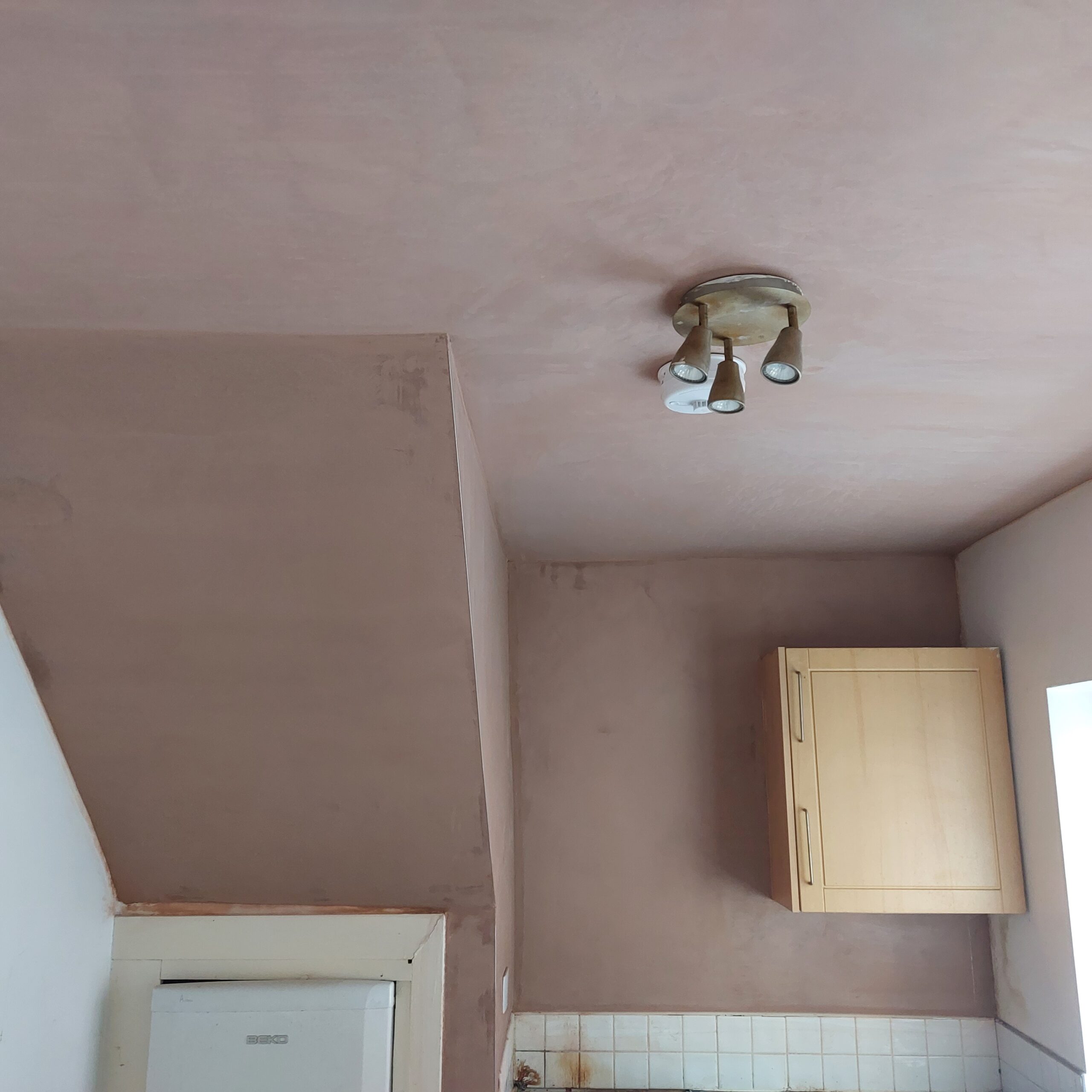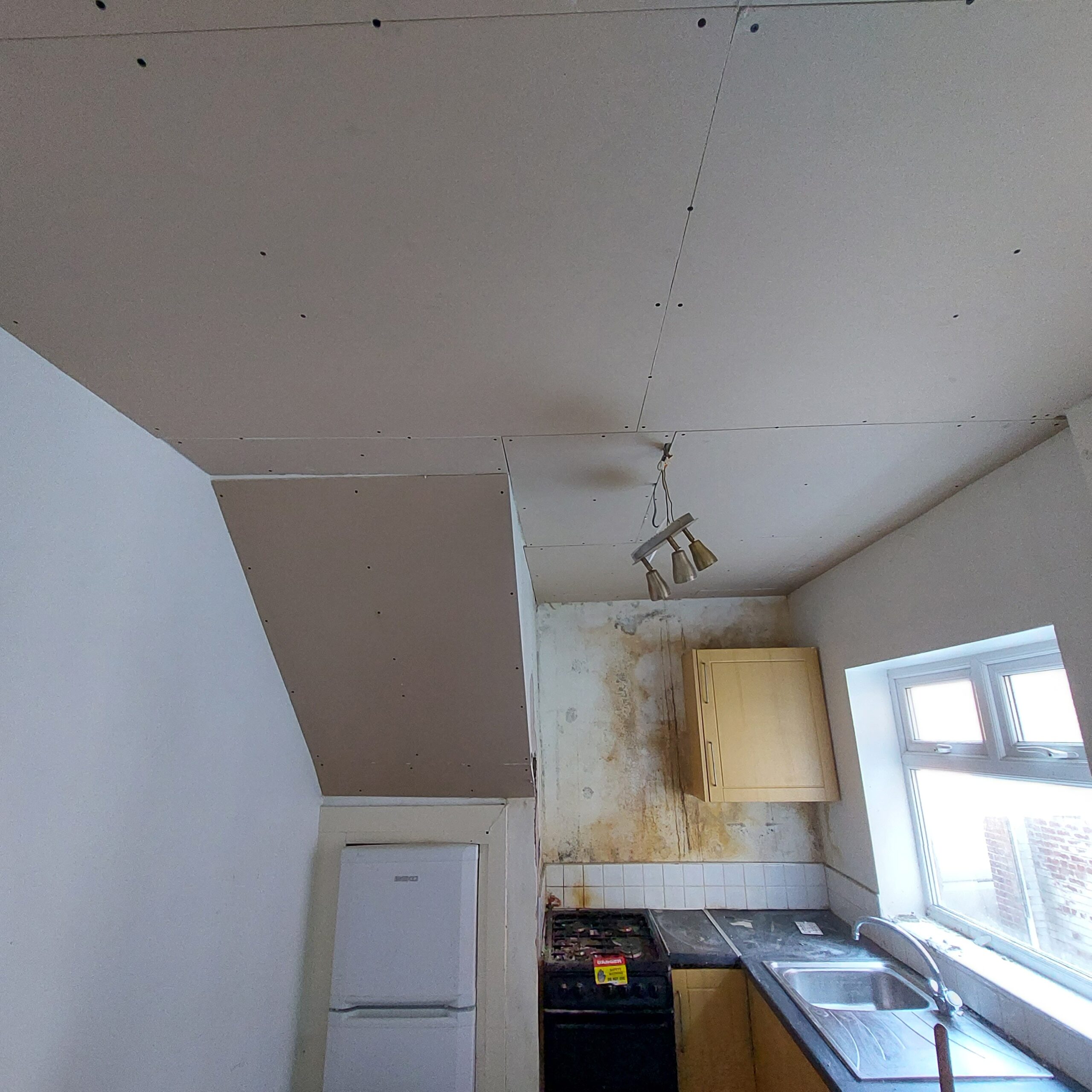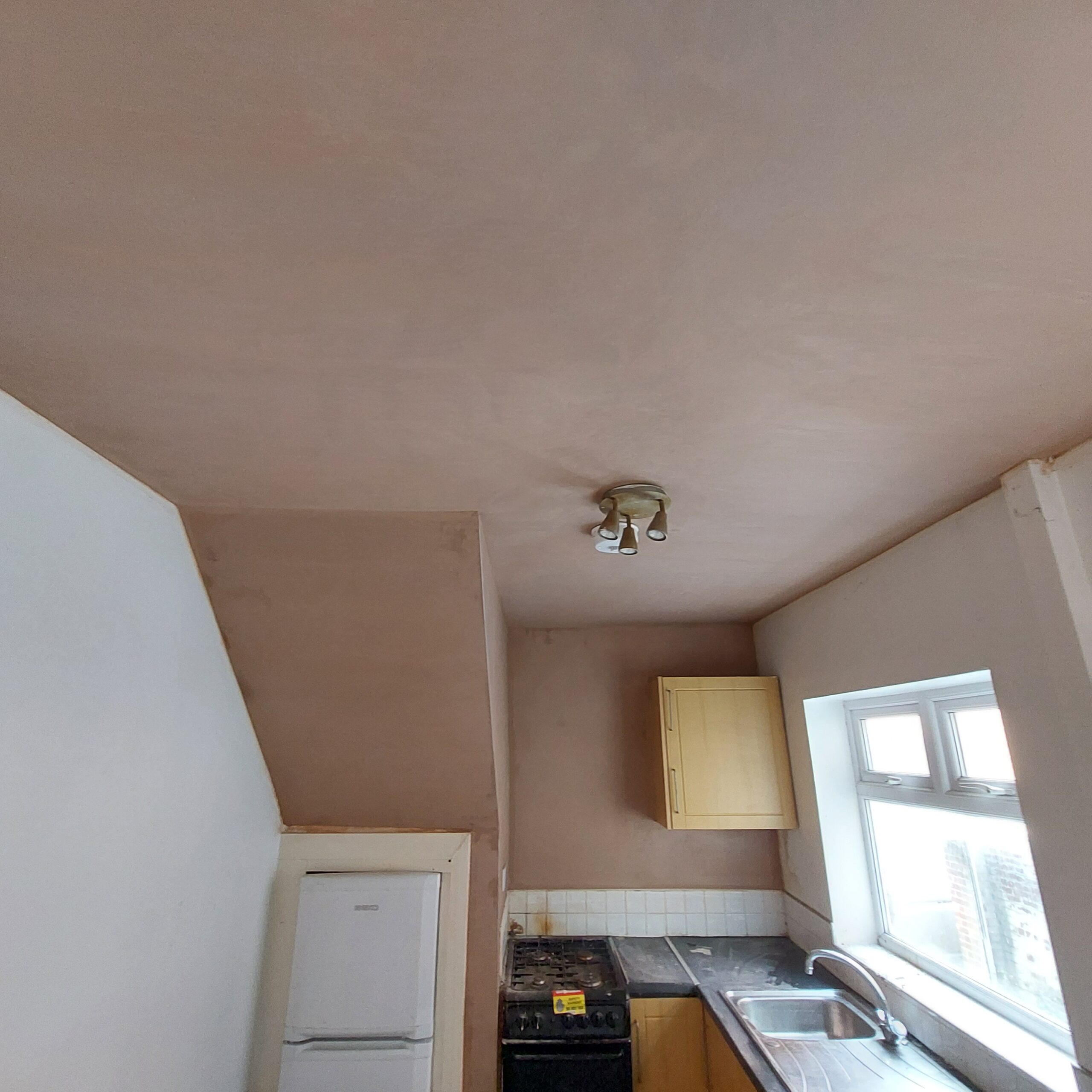 Kitchen by Skimit | Jan 5, 2024 | Newcastle upon Tyne Kitchen i plastered in Heaton, had suffered a leak from flat above which had completely damaged the ceiling and most of the walls. Loose plaster was removed and the ceiling fully overboarded. The ceiling and damaged walls were then skimmed flat.